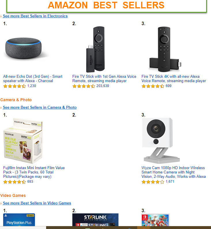 - AMAZON TOP SELLERS – Echo Dot, Fire TV Stick, Wyze Camera, Play Station Plus